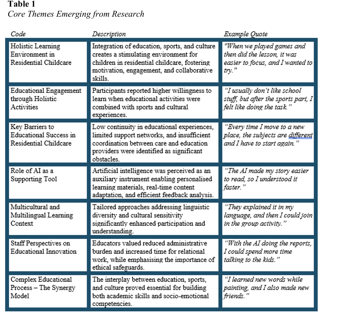 Table 1 summarises the key thematic codes identified through the analysis of qualitative data collected during the project. Each code reflects a distinct dimension of the educational experience in residential childcare, capturing both enabling factors and persistent barriers. The explanations clarify the scope and meaning of each code, while the example quotes, directly drawn from participant statements, provide authentic insight into the lived experiences of children and staff. The combination of holistic activities, personalised support, and culturally responsive approaches emerges as central to fostering motivation, engagement, and socio-emotional development. At the same time, structural barriers such as limited continuity and coordination remain critical challenges. The findings of our study reveal that the integration of education, sports, and culture within a single programme creates a dynamic and motivating learning environment for children in residential childcare. Participants demonstrated higher willingness to engage in educational activities when these were embedded in a broader set of experiences, including physical activity and creative cultural workshops. This multidimensional approach enhanced both cognitive and socio-emotional development.